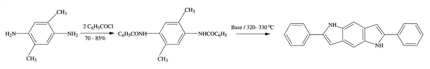 Otra faceta a través de la cual la síntesis de Madelung ha sido útil es la síntesis de 2,6-difenil-1,5-diaza-1,5-dihidro-s-indaceno, a partir de 2,5-dimetil-1,4-fenilendiamina..[4]