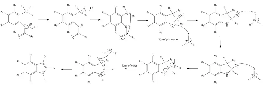 La reacción comienza con la extracción de un hidrógeno del nitrógeno del sustituyente de amida y la extracción de un hidrógeno bencílico del sustituyente orto al sustituyente de amida por una base fuerte. A continuación, el carbanión resultante de la extracción de hidrógeno bencílico realiza un ataque nucleófilo sobre el carbono carbonílico electrofílico del grupo amida. Cuando esto ocurre, el enlace pi de la amida se convierte en un par solitario, creando un oxígeno cargado negativamente. Después de estos pasos iniciales, ya no se requiere una base fuerte y debe producirse hidrólisis. El nitrógeno cargado negativamente se protona para recuperar su carga neutra, y el oxígeno se protona dos veces para albergar una carga positiva para convertirse en un buen grupo saliente. Un par solitario del nitrógeno forma un enlace pi para expulsar al grupo saliente cargado positivamente, y también hace que el nitrógeno albergue una carga positiva. El paso final de la reacción es una reacción de eliminación (específicamente una reacción E2), que implica la extracción del otro hidrógeno que alguna vez fue bencílico, antes de que se formara el compuesto bicíclico, cuyos electrones se convierten en un nuevo enlace pi en el anillo sistema. Esto permite que el enlace pi formado por nitrógeno en el paso anterior se convierta nuevamente en un par solitario en nitrógeno para restaurar la carga neutra de nitrógeno.