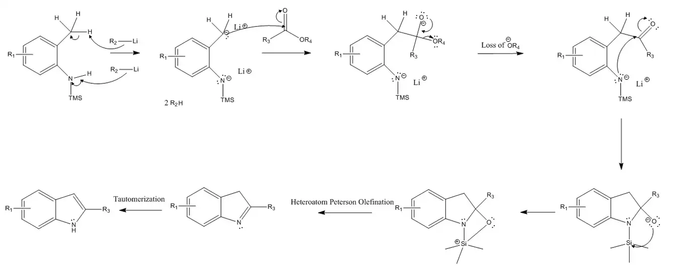 La síntesis de indol de Smith comienza con el uso de dos equivalentes de un reactivo de organolitio (ya que los reactivos de organolitio son bases muy fuertes) para extraer un hidrógeno tanto del sustituyente alquilo como del nitrógeno, lo que resulta en una carga negativa en ambos. La síntesis continúa con un ataque nucleofílico del carbanión sobre el carbono carbonílico electrofílico del éster o ácido carboxílico. Cuando esto ocurre, el enlace pi del electrófilo se convierte en un par solitario en el oxígeno. Estos pares solitarios se reconvierten nuevamente en un enlace pi, lo que resulta en la expulsión del grupo -OR. A continuación, el nitrógeno cargado negativamente realiza un ataque nucleófilo sobre el carbono carbonílico electrófilo adyacente, lo que hace que el enlace pi del electrófilo se convierta en un par solitario en el oxígeno. Este oxígeno cargado negativamente realiza un ataque nucleófilo en el átomo de silicio del grupo trimetilsililo (TMS), lo que resulta en un compuesto tricíclico y un átomo de silicio cargado positivamente y un átomo de oxígeno neutro. La síntesis avanza a través de una olefinación intramolecular de heteroátomo de Peterson, que finalmente produce una reacción de eliminación que expulsa un grupo TMSO y forma un enlace pi en el anillo de cinco miembros en el átomo de nitrógeno. Luego, se produce el tautomerismo cetoenólico, que da como resultado el producto deseado.
