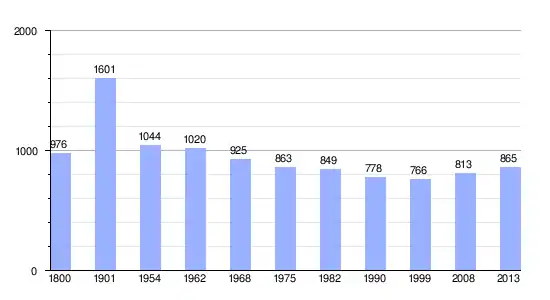 Los datos demográficos contemplados en este gráfico de la comuna de Saint-Cyprien-sur-Dourdou[4] se han cogido de 1800 a 1999 de la página francesa EHESS/Cassini, y los demás datos de la página del INSEE.[5]