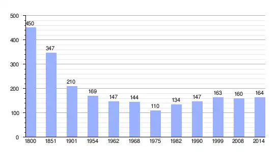 Los datos demográficos contemplados en este gráfico de la comuna de Saint-Germain-de-Montgommery[4] se han cogido de 1800 a 1999 de la página francesa EHESS/Cassini, y los demás datos de la página del INSEE.[5]