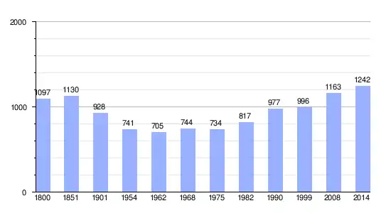 Los datos demográficos contemplados en este gráfico de la comuna de Saint-Jean-des-Baisants[4] se han cogido de 1800 a 1999 de la página francesa EHESS/Cassini, y los demás datos de la página del INSEE.[5]