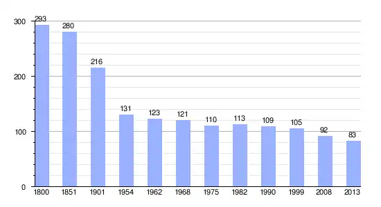 Los datos demográficos contemplados en este gráfico de la comuna de Saint-Julien-de-Bourdelles[4] se han cogido de 1800 a 1999 de la página francesa EHESS/Cassini, y los demás datos de la página del INSEE.[5]
