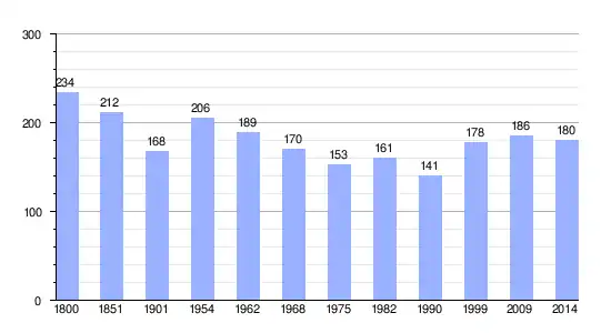 Los datos demográficos contemplados en este gráfico de la comuna de Saint-Loup-de-Fribois[4] se han cogido de 1800 a 1999 de la página francesa EHESS/Cassini, y los demás datos de la página del INSEE.[5]