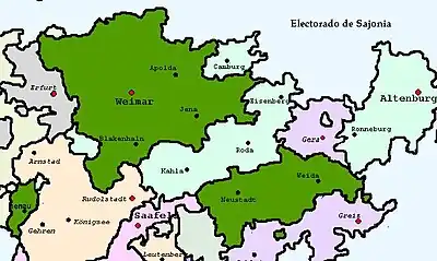 ![]() Sajonia-Weimar, dentro de los otros Ducados Ernestinos Sajonia-Jena, unida a Sajonia-Weimar en 1690. | |||||||||||||||||||||||||||||||