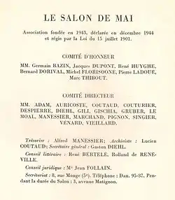 Bajo la presidencia de Gaston Diehl, el primer Salón de mayoen París, tuvo lugar en la galería Pierre Maurs (3, avenida Matignon) del 29 de mayo al 29 de junio de 1945.