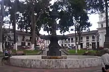 Izquierda: Iglesia de La Inmaculada (parque principal de Salamina), derecha: fuente de la Plaza de Bolívar (parque principal).