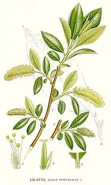 - Esta obra contiene una traducción derivada de «Salix pentandra» de Wikipedia en inglés, publicada por sus editores bajo la Licencia de documentación libre de GNU y la Licencia Creative Commons Atribución-CompartirIgual 4.0 Internacional.