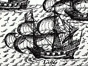![]() El San Buena Ventura fue construido tomando como modelo el Liefde (representado aquí), el barco en el cual William Adams llegó a Japón. | ||