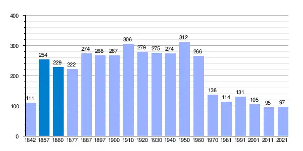 | Gráfica de evolución demográfica de San Pelayo de Guareña[8] entre 1842 y 2021 |