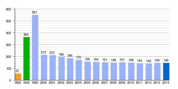 Población de derecho (1842-1897) según los censos de población del siglo XIX. Población de derecho (1900-1991) según los censos de población del INE. Población residente (2001-2011) según los censos de población del INE. Población según el padrón municipal de 2014 del INE. |