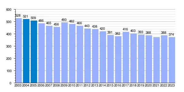 | Gráfica de evolución demográfica de Santa María del Berrocal[6] entre 2003 y 2023 |