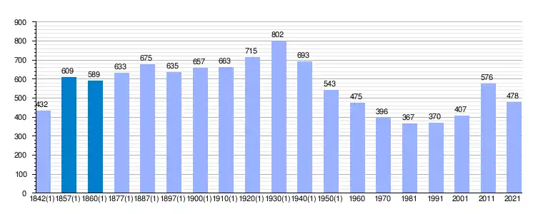 | Gráfica de evolución demográfica de Santa María del Tiétar[10] entre 1842(1) y 2021 |
