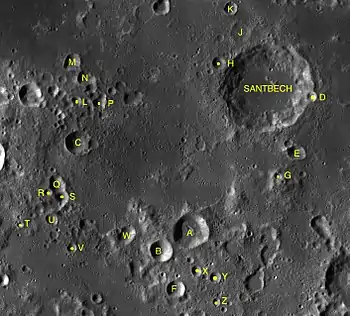 Por convención estos elementos son identificados en los mapas lunares poniendo la letra en el lado del punto medio del cráter que está más cercano a Santbech.[2]