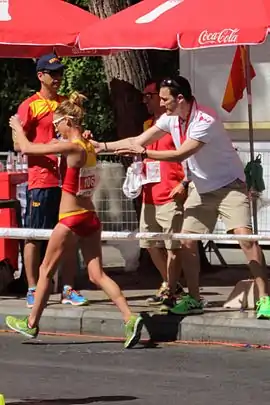![]() Santiago Pérez colaborando en el avituallamiento de Raquel González en la Copa de Europa de Marcha Atlética de 2015 celebrada en Murcia, España. | ||
