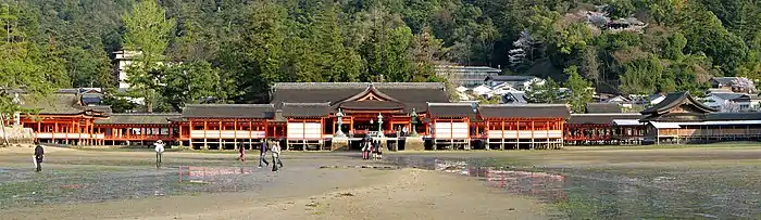 Así, en el Santuario Itsukushima, los edificios principales son el Honden (edificio principal y santuario), el Haiden (oratorio) y el Heiden (edificio de las ofrendas) alineados con el gran Torii. Enfrente está el Hirabutai (plataforma ceremonial), donde tienen lugar las danzas ceremoniales Kagura. Del Hirabutai parten dos corredores para el este y para el oeste, que se unen a los edificios secundarios del templo.