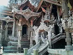 Inspirado en los templos del reino de Ayutthaya,[6] las características del templo de madera tallada a mano son propias de la arquitectura tailandesa. El templo fue construido por Lek Viriyaphan (Thai:เล็ก วิริยะพันธุ์).[7] Cada superficie de la estructura está decorada con ornamentación de las tradiciones thai, hindú, budista, china y jemer.[8]