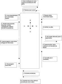 De igual forma que en la cara norte, el fondo también se divide en superficies pintadas con colores blancos, amarillos y oscuros: de izquierda a derecha, vemos que las imágenes se representan sobre amarillo, blanco, azul y blanco nuevamente.[25]