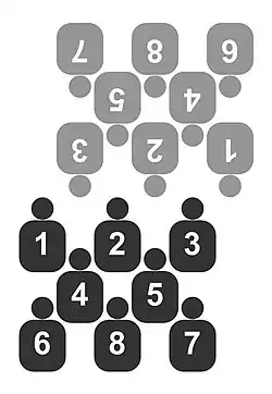 Cada uno de los bloques o packs de jugadores debe armarse y empujar según un sistema reglamentario, pensado en parte para evitar lesiones. Cada pack se forma con tres líneas de jugadores: una primera línea de tres jugadores, una segunda línea de dos jugadores y una tercera línea de tres jugadores. La primera línea está formada por los dos pilares uno a cada lado y el hooker en el medio, cuya función es usar su talón para enviar la pelota hacia atrás. La segunda línea está formada por dos jugadores, habitualmente jugadores altos. La tercera línea está formada por el ocho en el centro y a cada lado los alas. Los dos packs se oponen por la primera línea, intercalando las cabezas de los jugadores.[1]