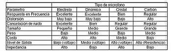 La calidad del micrófono probablemente es, el factor que más influye en la adquisición electrónica de señales del habla es el tipo de micrófono que se está usando. Existen, principalmente, cuatro tipos de micrófonos disponibles en el mercado, los cuales son el electreto, el dinámico, el de cristal y el de carbón. Para percibir fácilmente las diferencias entre estos tipos de micrófonos, sus características principales son comparadas en la siguiente tabla.