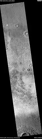 Muchas áreas sobre Marte experimentan el paso de diablos de polvo gigantes. Un recubrimiento delgado de polvo brillante y muy fino cubre la mayoría de la superficie de Marte. Cuando un diablo de polvo atraviesa una de estas zonas levanta el recubrimiento de polvo, dejando a la vista la superficie oscura subyacente. Se han observado diablos de polvo con un extremo sobre el terreno y el otro en órbita.