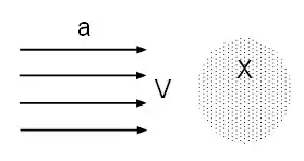 Estadísticamente, a los núcleos de los átomos de una placa se les puede considerar círculos diminutos de radio r distribuidos a lo largo de un plano de superficie A. En el diagrama siguiente se representa un grupo de partículas a que inciden a velocidad V sobre un grupo de partículas X que actúan como blanco de las primeras. Así la probabilidad de impactar contra una de esas partículas distribuidas en la lámina es (nπr2)/A, donde n representa el número de partículas X distribuidas en la superficie A.
