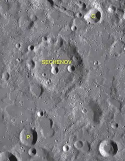 ![]() Localización del cráter Sechenov (centro de la parte derecha de la imagen) |