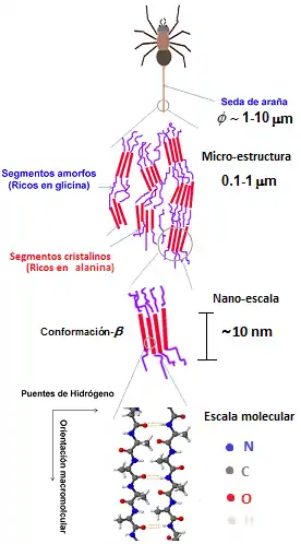 Como muchas otras proteínas funcionales presentes en los seres vivos[18] las de las sedas de araña se caracterizan por tres niveles estructurales, principalmente. El primero o "estructura primaria" se refiere a la secuencia polipeptídica característica de cada proteína, en la que los distintos aminoácidos están unidos entre sí por enlaces peptídicos. El segundo nivel, "estructura secundaria", hace referencia a la conformación que adquieren estas cadenas polipeptídicas en el espacio y se caracteriza por asociaciones intramoleculares de tipo enlace de hidrógeno. La "estructura terciaria" hace referencia a la interacción y disposición entre las subestructuras secundarias.