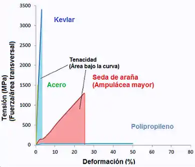 Aunque cada tipo de seda tiene propiedades mecánicas diferentes, dependiendo de su funcionalidad[65] y especie, se puede considerar que en la mayoría de los casos las propiedades mecánicas de las sedas de araña son asombrosas desde el punto de vista ingenieril. Presentan en todos los casos una combinación excepcional de resistencia a la rotura y extensibilidad, y por lo tanto de tenacidad. Un error comúnmente difundido en los medios de comunicación es su comparación con el acero. La seda de araña presenta resistencia similar a la del acero, pero no superior. Sin embargo, considerando la densidad de ambos materiales[25] (la seda 1,3 g cm−3 y el acero 7,8 g cm−3) y tomando la misma cantidad de material, la seda es unas cinco veces más resistente por unidad de masa. El Kevlar —poli(para-fenileno-tereftalamida)— es más resistente que el acero y la seda. La seda de araña, sin embargo, con una resistencia análoga a la del acero, admite deformaciones en torno a 10 veces superiores (30%). Ello hace que para su deformación se requieran grandes cantidades de energía mecánica. Esto se cuantifica mediante el concepto de tenacidad (área bajo la curva tensión-deformación), donde la seda de araña es el paradigma de todos los materiales.[25]