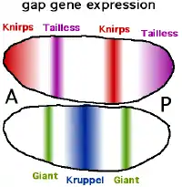 - Los genes gap: los genes gap dividen el embrión en grandes regiones con varios segmentos (los organismos con en los que tales genes han sufrido una mutación carecen de varios metámeros consecutivos. Entre ellos se encuentran Krüppel, knirps, hunchback, giant y tailless.