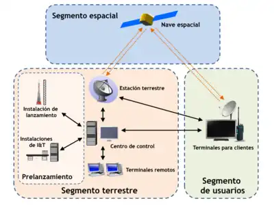 Un segmento terrestre consta de todos los elementos en tierra de un sistema de naves espaciales utilizado por los operadores y el personal de apoyo, a diferencia del segmento espacial y el segmento de usuario.[1][2] El segmento terrestre permite la gestión de una nave espacial, y la distribución de datos de carga útil y telemetría entre las partes interesadas en el terreno. Los elementos primarios de un segmento de tierra son: