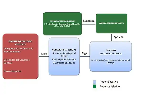 El conflicto alcanzó dimensiones internacionales dentro del mundo árabe cuando Egipto y los Emiratos Árabes Unidos bombardearon las posiciones del Amanecer Libio en Trípoli y de los milicianos en Bengasi, mientras que Catar y Turquía eligieron financiar a dichos grupos y entregarles suministros militares. Por otro lado, beneficiándose del vacío de poder, cientos de yihadistas del Estado Islámico se trasladaron a la nación africana desde Siria e Irak y se hicieron temporalmente con el control de varias ciudades del país, entre ellas Derna y Sirte, si bien fueron derrotados con el apoyo de la comunidad internacional. Ante la gravedad que había alcanzado la situación, Naciones Unidas diseñó un plan de paz (Misión de Apoyo de las Naciones Unidas en Libia; UNSMIL por sus siglas en inglés) en virtud del cual se elegiría consensuadamente por delegados de ambos bandos un Ejecutivo de transición (GNA). La Cámara de Representantes permanecería como la Cámara Baja del país, al tiempo que el Congreso General se convertiría en una Cámara Alta, el Consejo de Estado Superior. El proyecto fue satisfactoriamente aprobado por todos los delegados del plan de paz a título personal y por la Cámara de Representantes, si bien fue rechazado por el Congreso General. Sin embargo, la lista concreta de ministros presentada por los delegados, con Fayez al-Sarraj como jefe del Ejecutivo de transición, no fue tampoco aprobada por la Cámara. A pesar de ello, la nueva administración pasó a ser considerada por Naciones Unidas como el representante legítimo de Libia.