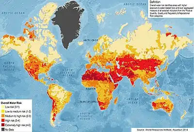 El agua, en términos absolutos, no escasea en todo el planeta. Pero, según la organización del agua de las Naciones Unidas, ONU-Agua, el suministro total de agua dulce utilizable para los ecosistemas y los seres humanos es de solo 200.000. km 3 de agua: menos del uno por ciento (<1%) de todos los recursos de agua dulce. El agua dulce utilizable incluye el agua no contaminada o degradada por productos químicos que alteran el agua, como las aguas residuales o cualquier otro producto químico nocivo de uso previo continuo.[12] En el siglo XX, el uso del agua ha crecido a más del doble de la tasa de aumento de la población. Específicamente, se prevé que las extracciones de agua aumenten en un 50 por ciento para 2025 en los países en desarrollo y en un 18 por ciento en los países desarrollados.[13] Se ha pronosticado que África tendrá entre 75 y 250 millones de habitantes sin acceso a agua potable.[14] Para 2025, 1.800 millones de personas vivirán en países o regiones con escasez absoluta de agua, y dos tercios de la población mundial podrían estar en condiciones de estrés hídrico.[15] Para el 2050, más de la mitad de la población mundial vivirá en áreas con escasez de agua, y otros mil millones podrían carecer de agua suficiente, según investigadores del MIT.[16]