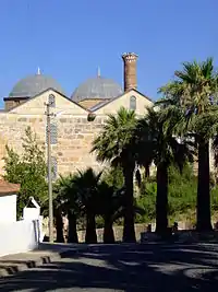 ![]() Tres períodos en la historia de Selçuk: Templo de Artemisa (al frente), Mezquita de Isa Bey, construida por los turcos selyúcidas (en el medio), El castillo o fortaleza otomano (a lo lejos).