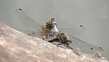 La competencia espermática es aquella en la que la propia cópula de un macho actúa impidiendo que los gametos de otros machos fecunden a la hembra.[29] La competencia espermática parece ser la responsable de las marcadas diferencias entre los genitales de especies muy cercanas filogenéticamente, especialmente en insectos, y quizás por ello poseen un fuerte mecanismo de especiación.[30] Existen numerosos ejemplos de este tipo de competencia dentro del mundo de los insectos. La libélula Orthetrum cancellatum, por ejemplo, tiene una particular forma de reproducción donde la hembra se aparea con varios machos, no siendo inmediatamente fecundada por ninguno de ellos y guardando una espermateca en su interior. Los machos de esta especie han desarrollado en su aparato reproductor una estructura preparada para extraer del cuerpo de la hembra la espermateca de los machos que la han fecundado con anterioridad. Otra especie similar, Crocethemus erythracea, inyecta su espermateca con gran fuerza dentro del cuerpo de la hembra gracias a un apéndice especial de su pene para situarla por delante de la de sus competidores.[31]