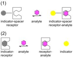 Los sensores químicos,[13][14] se están desarrollando para moléculas objetivo específicas e iones en los que el objetivo (huésped) forma un complejo con un sensor (host). El sensor está diseñado para ser una excelente coincidencia en términos de tamaño y forma del objetivo para proporcionar la máxima selectividad de enlace. Un indicador está asociado con el sensor que experimenta un cambio cuando el objetivo forma un complejo con el sensor. El cambio del indicador suele ser un cambio de color (gris a amarillo en la ilustración) visto en la absorbancia o, con mayor sensibilidad, luminiscencia. El indicador puede estar unido al sensor a través de un espaciador, en la disposición ISR, o puede ser desplazado del sensor, disposición IDA.