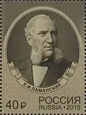 ![]() | 04.06 | 1) Retrato de Yevgueni Lamanski, segundo presidente del Banco del Estado del Imperio Ruso La hoja bloque muestra las figuras alegóricas "Cosecha" y "Abundancia", ejecutadas en el arco de una de las ventanas del edificio del Banco de Rusia (Moscú) y el edificio del antiguo Banco del Estado del Imperio Ruso (San Petersburgo) | 39,0 × 39,0 (145 × 100) | 40,00 |