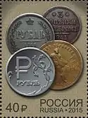 ![]() | 2) Cuatro monedas históricas: 3 kópeks de 1841, 1 rublo de 1866, ducado de oro de 1923 y 1 rublo de 2014 | |||