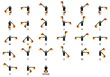 Un semáforo de banderas[12] es el sistema de telegrafía que transmite información a distancia mediante señales visuales con banderas de mano, varillas, discos, palas o, ocasionalmente, manos desnudas o enguantadas. La información está codificada por la posición de las banderas.[13]