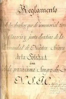 Dicha Cofradía tendría como imagen titular a Cristo (como se menciona más abajo, seguramente un Ecce Homo). Con el paso del tiempo debió incorporar una imagen de María por lo que comenzó a conocerse como de la 'Virgen de la Soledad o de la Preciosísima Sangre de Nuestro Señor Jesucristo', testimonio documental de ello se encuentra en la portada del libro de actas de la Cofradía de la Soledad que data de 1862. La noticia más antigua que constata la existencia de la Virgen de la Soledad es del año 1780, o sea, después de muchos años de existencia de la Cofradía de la Preciosísima Sangre con su imagen titular.