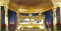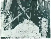 Según Díaz, la imagen se encontraba en la iglesia de Santo Domingo de la Antigua Guatemala y que perteneció a la reina Catalina de Aragón, primera esposa de Enrique VIII.[36] En su momento, estas afirmaciones fueron tomadas al pie de la letra por convenir a la campaña anticomunista en contra del gobierno del coronel Jacobo Arbenz Guzmán.[37][lower-alpha 6] Esto ha hecho que la historia del Señor Sepultado esté rodeadas de misterio y leyenda y aunque su origen sea desconocido, la historia que contó Díaz que dice que la imagen fue encontrada flotando por las costas del Atlántico Hondureño, y posteriormente fue llevada a Guatemala y que en alguna oportunidad perteneció a Catalina de Aragón, primera esposa de Enrique VIII[38] aún perviva en el ideario católico de los guatemaltecos más devotos de esta imagen en Guatemala.[37]