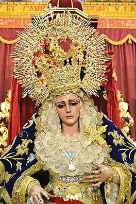 María Santísima Madre de la Misericordia: Autoría: La imagen es obra de Enrique Pérez Saavedra. Fue bendecida el 17 de marzo de 1984. La restauración fue llevada a cabo por su autor. Al igual que el Cristo, fue sometida a una intervención de conservación a cargo de las restauradoras Ana Beltrán Ruiz y Verónica García Piedad (2005), quienes cambiaron el candelero y limpiaron su policromía. Asimismo, Elías Rodríguez Picón restauró uno de sus brazos y otros elementos en 2011. Palio: Los respiraderos del Palio se encargaron a la Orfebrería Ramos y cuenta con figuras de la Virgen de la Cinta, la Virgen del Pilar y la Virgen de los Milagros. En años correlativos se fue complementando con varales, candelería y faroles de cola de Ramón León Peñuelas. El conjunto fue bordado por Francisco Seda. El cielo del palio cuenta con pinturas de José Romero Benítez. Capataz: Emilio González Lobato Música: Banda de Música Virgen de las Mercedes [10]