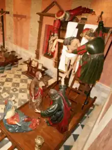 - 'El Descendimiento. Un paso: "El Descendimiento de la Cruz" (conocido popularmente como La Escalera), compuesto por seis figuras realizadas en el siglo XVII por el escultor Francisco Díez de Tudanca y una más, la de la Virgen (conocida popularmente como La Malquerida) añadida en el siglo XX y realizada por Mariano Nieto. Reproduce el diseño del paso homónimo de la cofradía de la Vera Cruz de Valladolid. Es uno de los llamados Pasos Grandes y su dificultad de manejo estriba en la considerable altura del conjunto. Posee la leyenda de que la mujer que toca desde un balcón, durante la procesión, el pie de la imagen de Nicodemo, se casa al año siguiente. Los hermanos visten túnica de algodón blanco. Desfila el Viernes Santo.