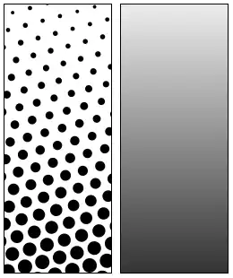 Mientras imágenes con tonos continuos contienen una gama infinita de colores o grises, el proceso de los semitonos reduce estas reproducciones visuales a una imagen binaria que se imprime con un solo color de tinta. Esta reproducción binaria se basa en una ilusión óptica, en donde esos pequeños puntos son mezclados en tonos suavizados por el ojo humano. A nivel microscópico, las películas fotográficas en blanco y negro también contienen sólo dos tonos, y no una gama infinita de tonos continuos.