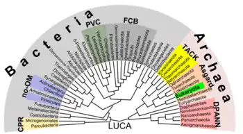Las relaciones filogenéticas de los seres vivos son motivo de controversia y no hay un acuerdo general entre los diferentes autores. En la actualidad parece claro que los eucariontes derivan de las arqueas con la incorporación por endosimbiosis de una bacteria,[46][47] pero hay discrepancia en dónde poner a bacterias y arqueas.