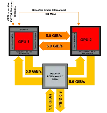 Esta generación de diseño de doble GPU conserva el uso de un puente PCI Express, PLX PEX 8647 con una disipación de potencia de 3,8 vatios incluida la compatibilidad con PCI Express 2.0, lo que permite dos GPU en la misma ranura PCI Express con el doble de ancho de banda que la generación anterior de producto (Radeon HD 3870 X2). Las generaciones posteriores de diseño de doble GPU también cuentan con una interconexión para las comunicaciones entre GPU mediante la implementación de un CrossFire X SidePort en cada GPU, lo que brinda un ancho de banda entre GPU full-duplex adicional de 5 GB/s. Estas dos características aumentan el ancho de banda total para diseños de doble GPU a 21,8 GB/s.
