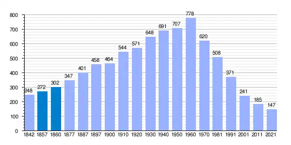 | Gráfica de evolución demográfica de Serradilla del Llano[5] entre 1842 y 2021 |