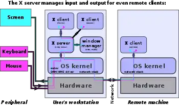 Un ejemplo de servidor gráfico es X.Org, el cual corre sobre kernel. Recibe datos de evdev y los pasa a uno de sus clientes. El servidor gráfico también recibe datos de sus clientes; procesa el dato, realiza la composición y pasa el dato a uno de los tres componentes del kernel – DRM, o driver KMS. El componente escribe el dato al framebuffer y contenido del framebuffer se transmite a la pantalla conectada para visualizarlo. X se basa en GLX.