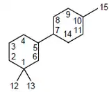 Los bisabolanos (1-(1,5-dimetilhexil)-4-metilciclohexano) son un grupo ampliamente distribuido en la naturaleza como componentes de las plantas superiores. El sistema de numeración utilizado para bisabolanos es el mismo que el sistema de farnesano. Muchos bisabolanos contribuyen al aroma de los aceites esenciales, como el caso del zingibereno, el cual es un constituyente del aceite esencial del jengibre.[12] El sesquicineol es otro caso de un componente que contribuye los aromas de aceites esenciales de Senecio subrubriflorus, Anthemis alpestris, Aydendron barbeyana y Boronia megastigma.[13] El ácido sidówico es un epoxibisabolano producido por Aspergillus sydowi.[14] El Yingzhaosu A es un endoperóxido de bisabolano que ha sido aislado de la planta medicinal china Artabotrys uncinatus[15]