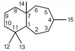 El drimano es un hidrocarburo bicíclico sesquiterpénico que se encuentra naturalmente en el petróleo.[32] Es prototipo estructural de diversos metabolitos secundarios aislados de hongos y plantas superiores. El primer compuesto de este tipo, el cual fue nombrado drimenol, se aisló de la planta chilena Drimys winteri.[33] Los esqueletos de drimano se forman por una biciclización concertada de pirofosfato de farnesilo. Los compuestos de las series ent- tales como la Iresina han sido aisladas de plantas del género Iresine.[34][35][36] Muchos de estos compuestos presentan actividad antialimentaria contra insectos[37] Los drimanos (Decahidro-1,1,4a,5,6-pentametilnaftalenos) se han aislado de hongos, esponjas y plantas superiores. La biosíntesis se elucida como un biciclización concertada del pirofosfato de farnesilo.